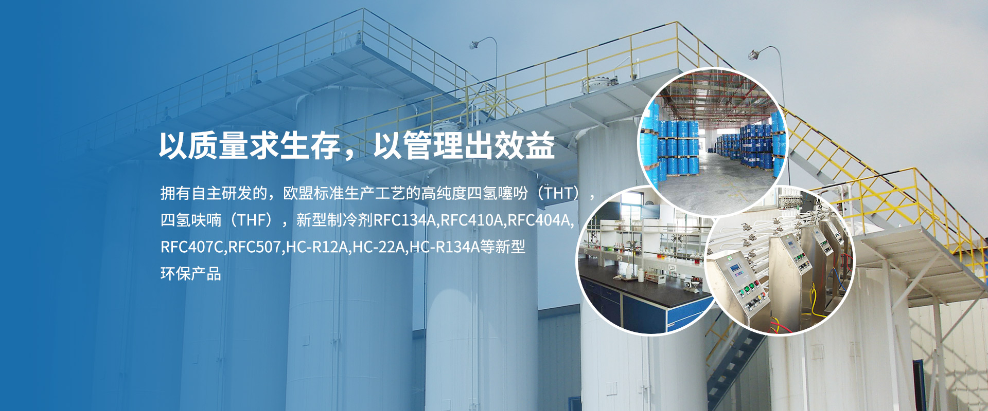 擁有自主研發(fā)的,歐盟標(biāo)準(zhǔn)生產(chǎn)工藝的高純度四氫噻吩(THT),四氫呋喃(THF),新型制冷劑RFC134A,RFC410A,RFC404a,RFC407c,RFC507,HC-R12A,HC-22A,HC-R134A等新型環(huán)保產(chǎn)品。